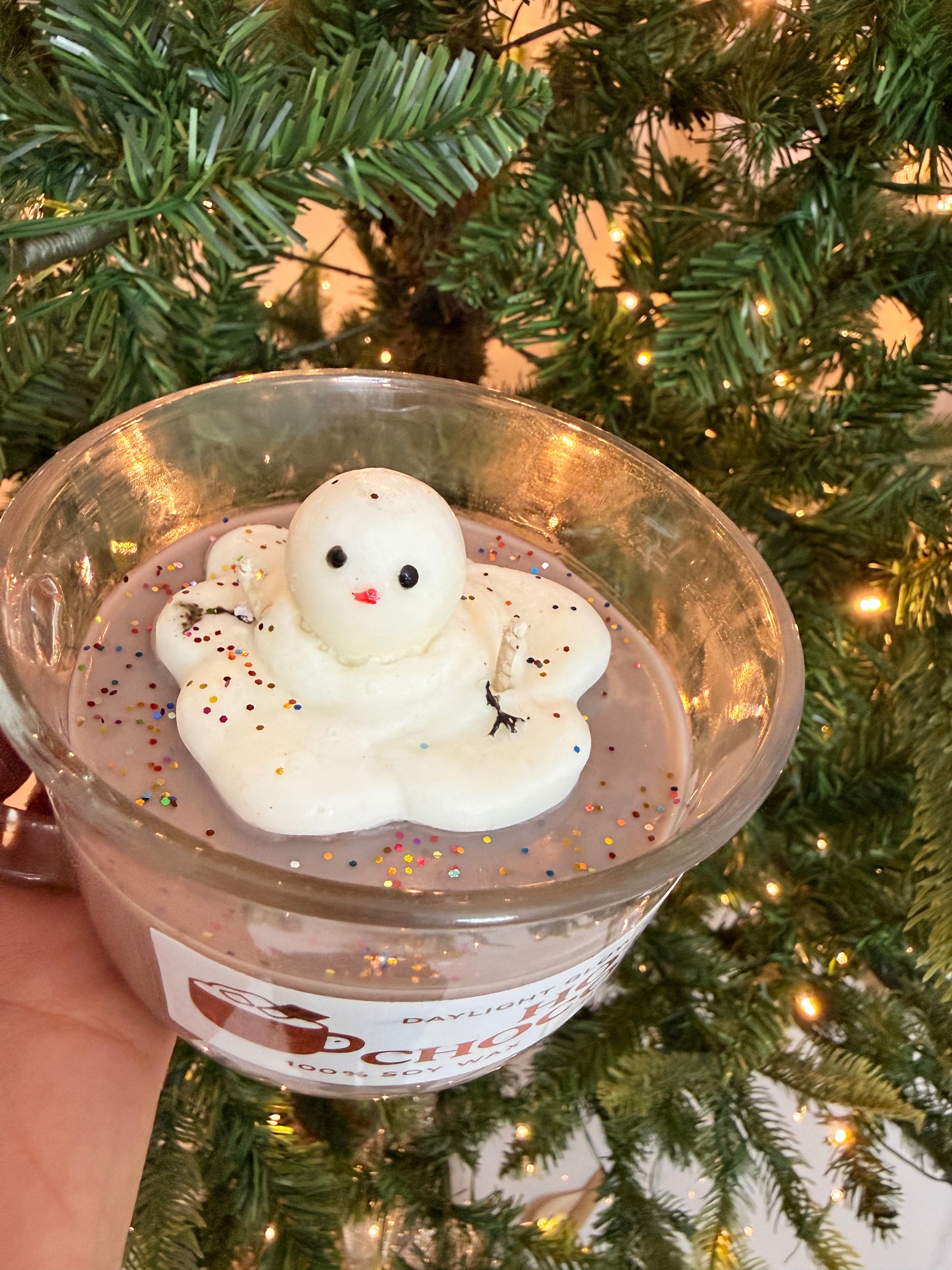 But the real delight is in its decoration: a whimsical snowman “melting” into the hot cocoa, like a scoop of ice cream slowly blending with the warmth. Every detail, from the smooth chocolate base to the frothy wax swirls, is crafted by hand to make this candle a true piece of art.